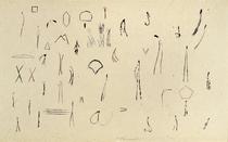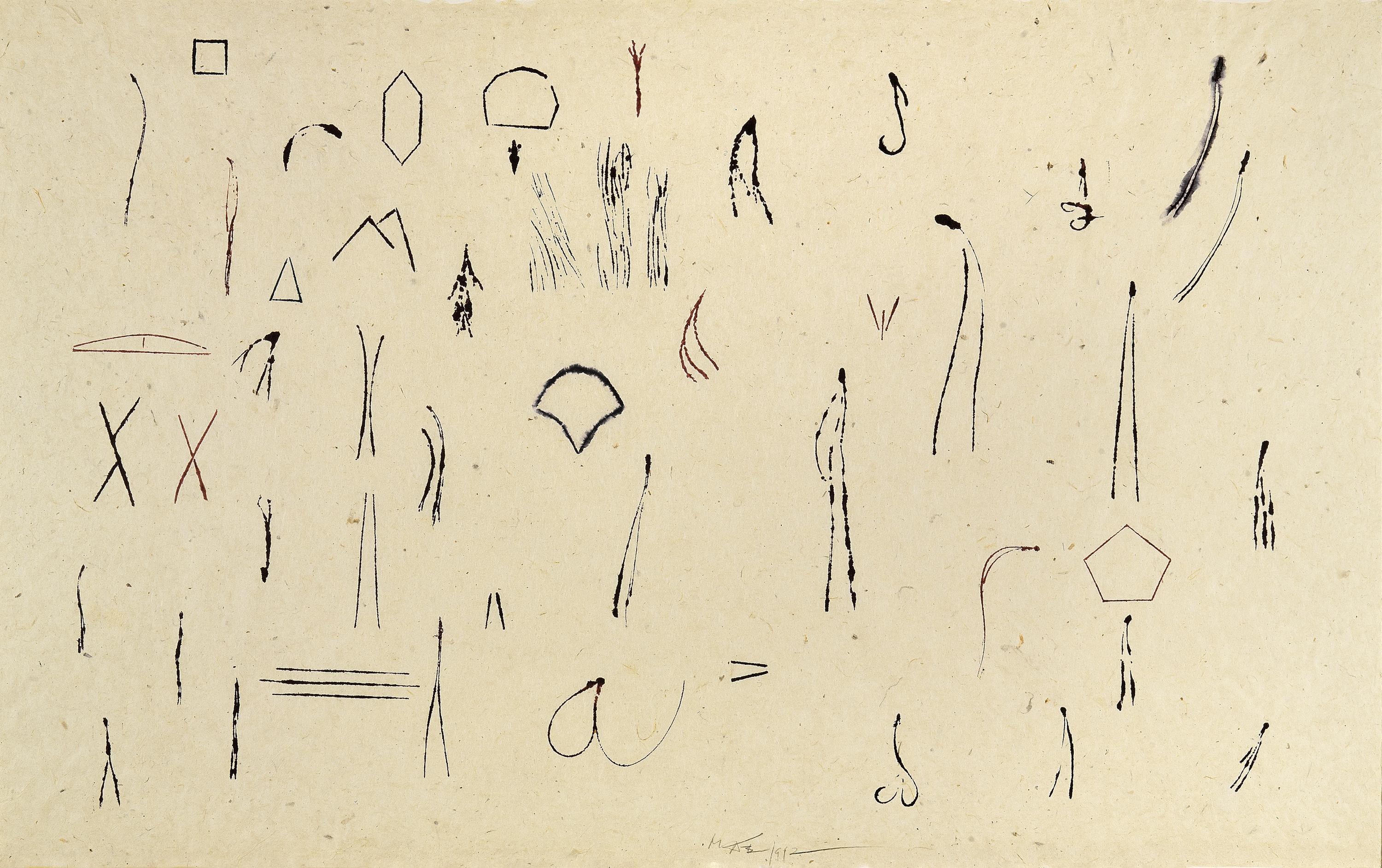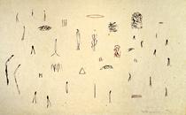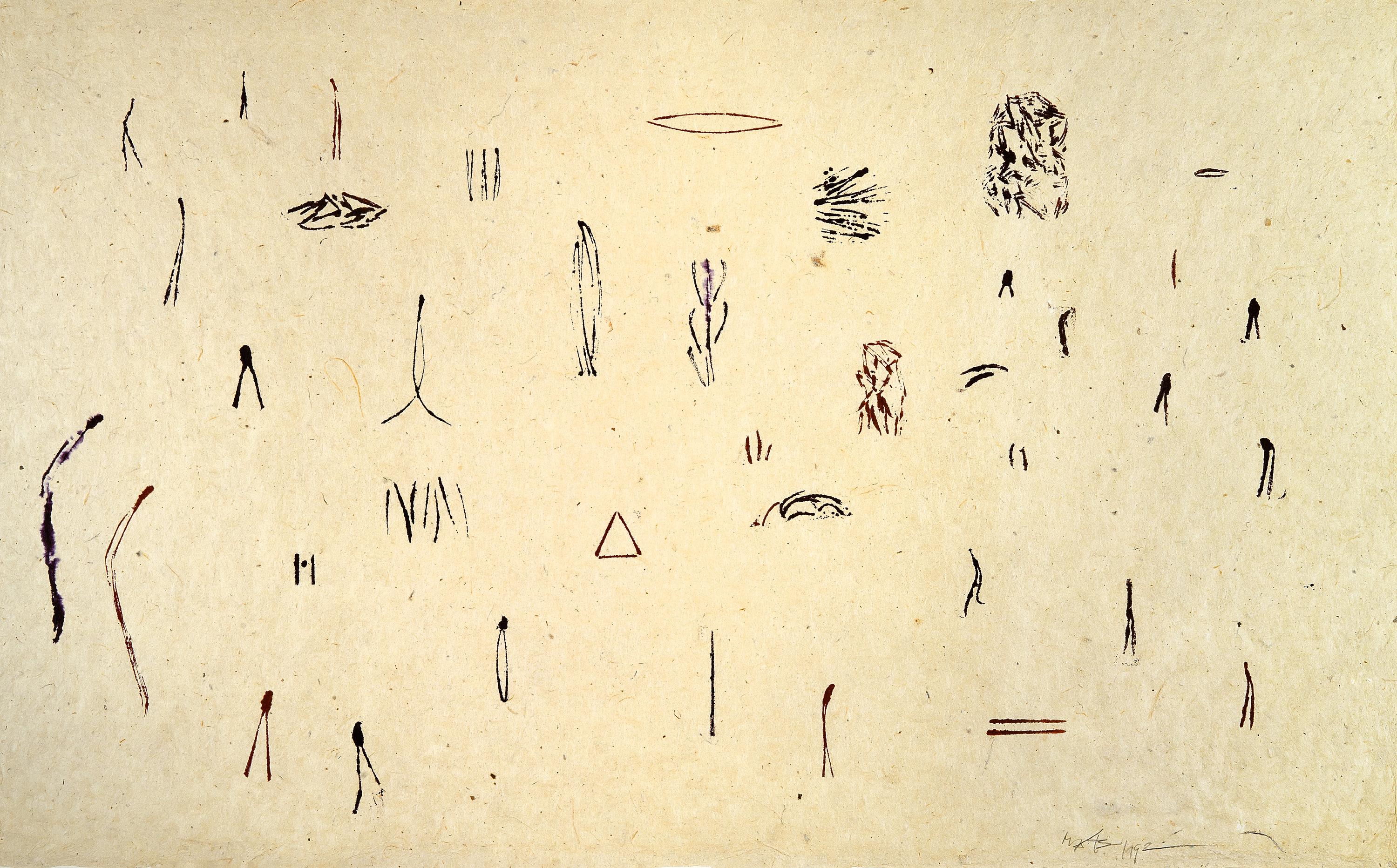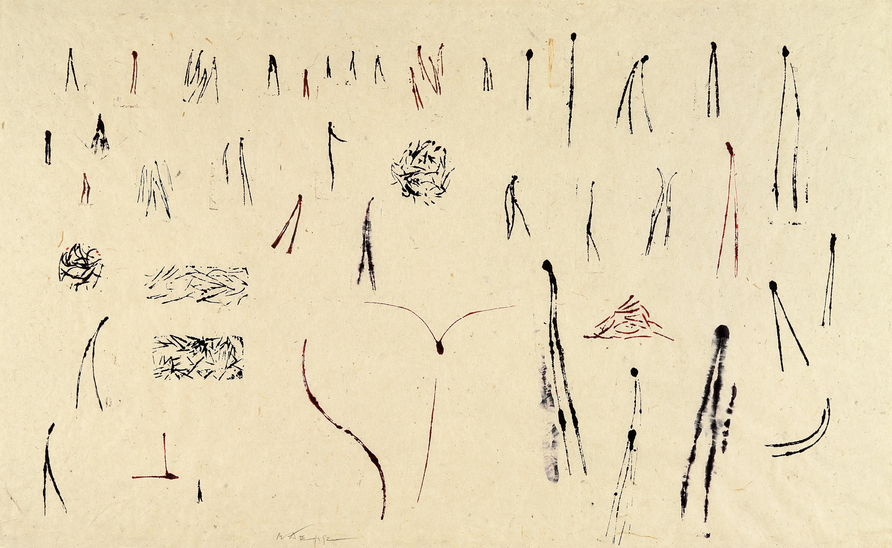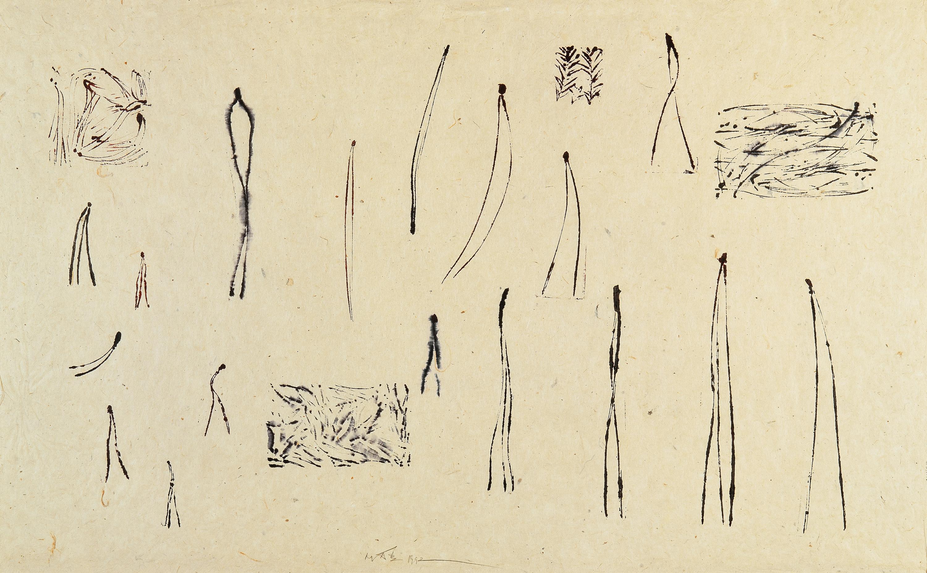 Cabinet of Conifer Needles I-IV (1992) is a set of drawings forming part of a large series made by stamping prints of conifer needles in different shades of India ink onto handmade paper. The artist spent several months collecting the needles in different parts of Spain and elsewhere, looking for the rarest and most diverse specimens. Using some of those he considered most special, he made stamps of individual needles or groups of needles with wooden bases and handles, to create a giant forest printing press. In some cases, after applying the stamps to the paper, he dilutes certain areas to create particular atmospheres or bring out hidden images.